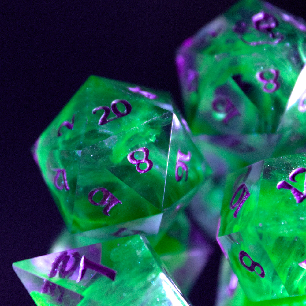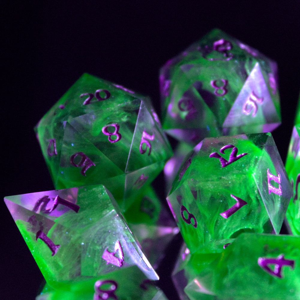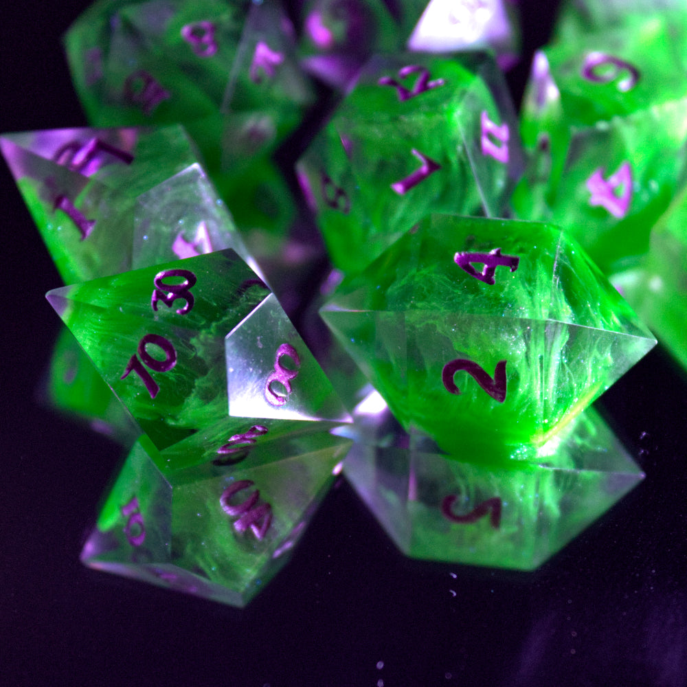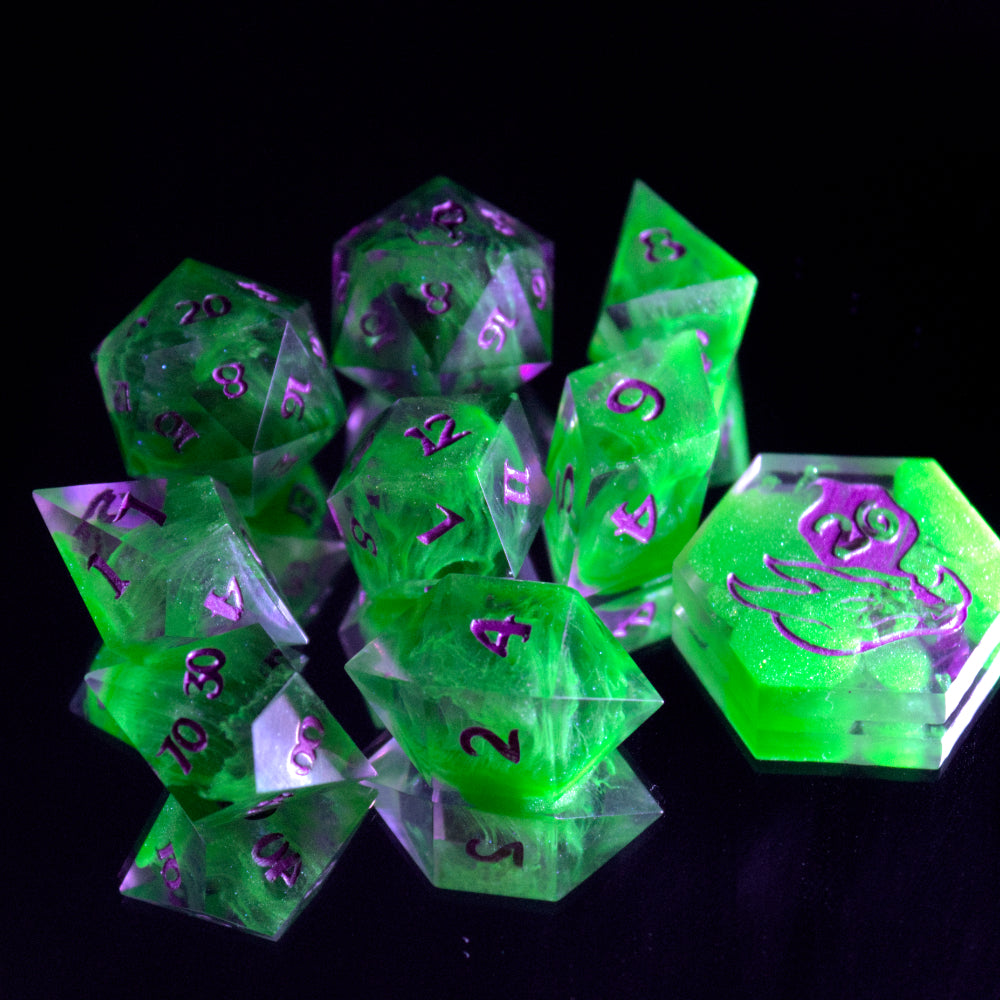 All my dice are custom designed and handcrafted, making them 100% unique. Each dice is individually molded and polished so that no two dice are ever the same. This also acknowledges that our dice have the occasional small imperfections such as scratches and bubbles, adding to their authenticity.