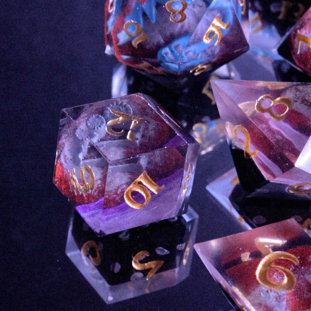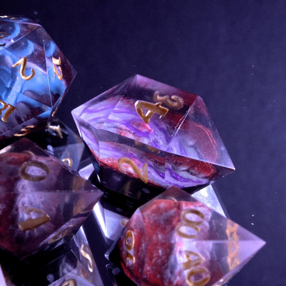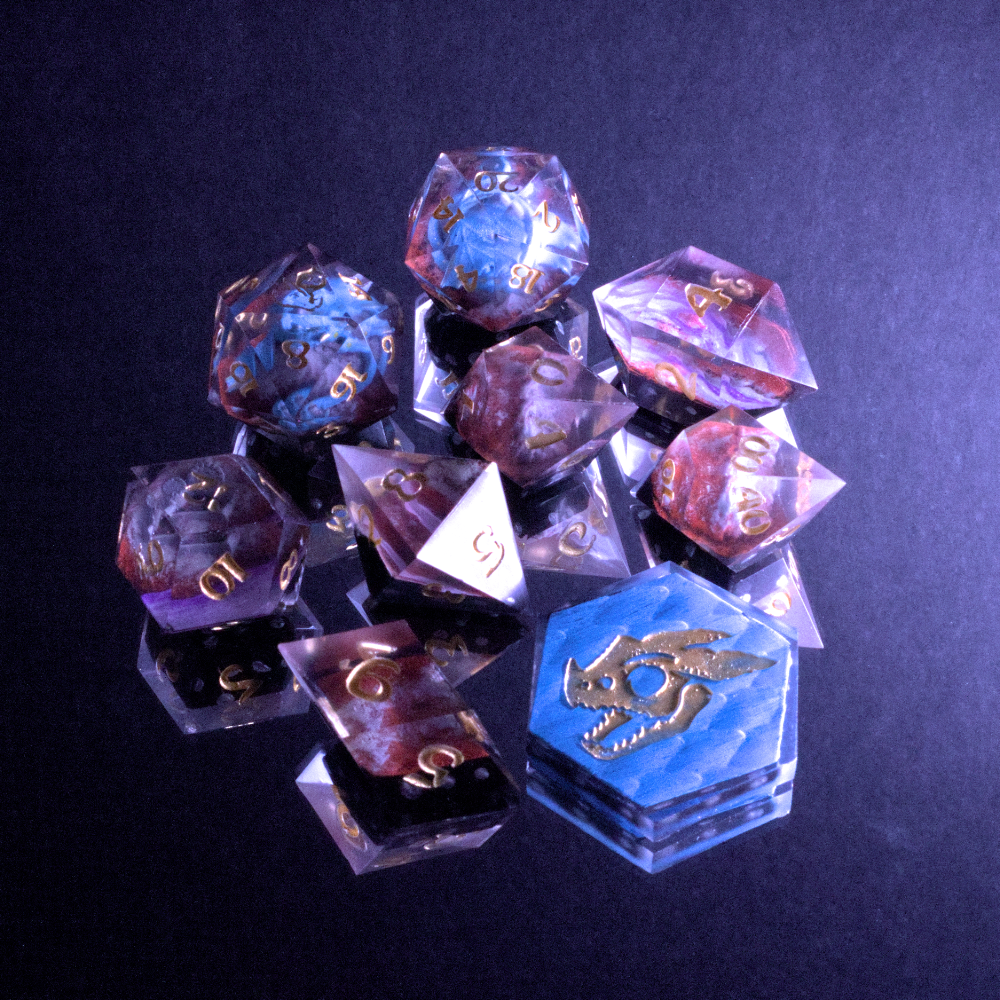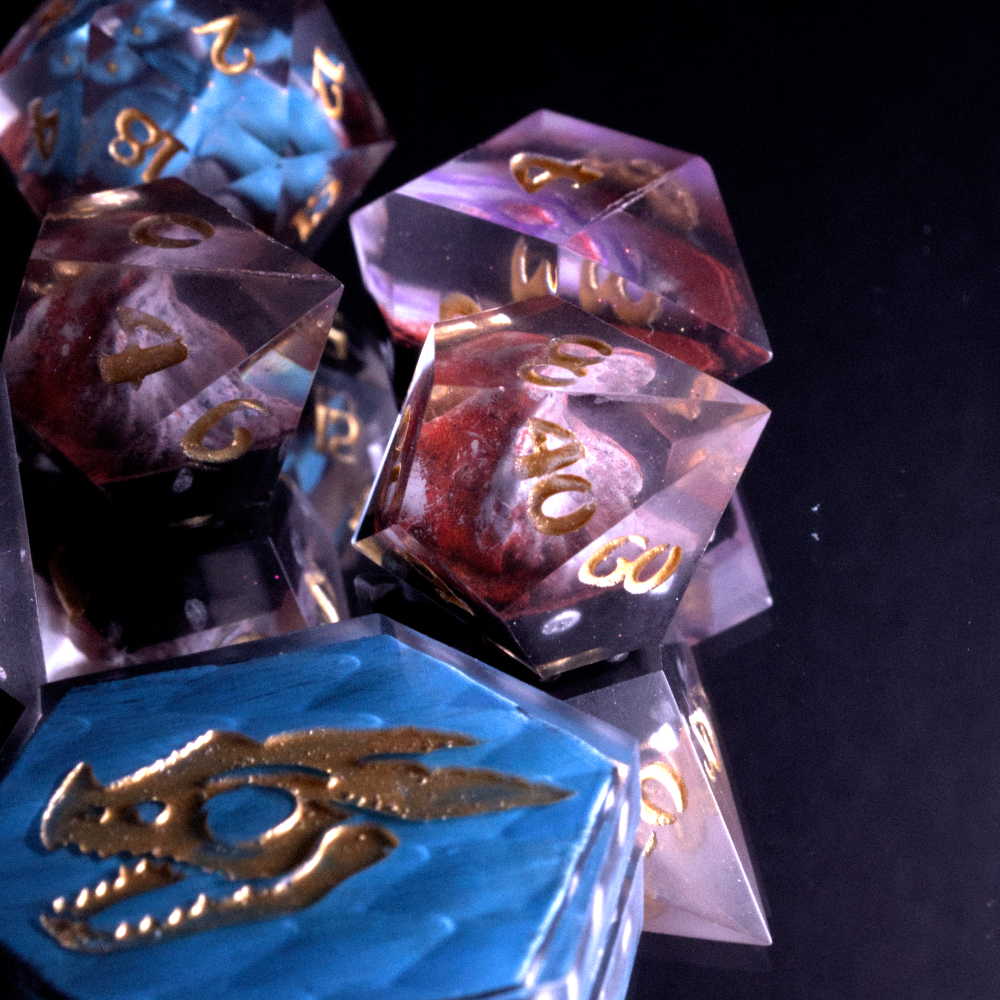 All my dice are custom designed and handcrafted, making them 100% unique. Each dice is individually molded and polished so that no two dice are ever the same. This also acknowledges that our dice have the occasional small imperfections such as scratches and bubbles, adding to their authenticity.
