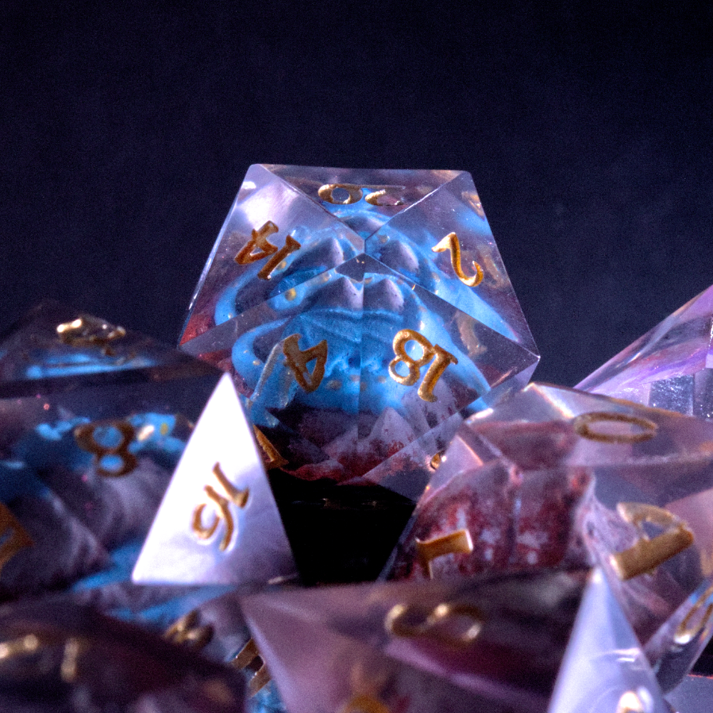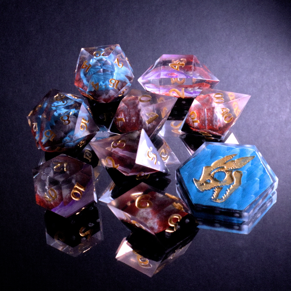 - Clear resin surrounding custom 3d modeled and handpainted Mythical Landscape Inclusions. D20's depict a Dragon curled across three mountain tops. D12 is a castle on the shore of a lake. D10 and D00 are creating cliffsides. D8 is a narrow valley. D6 is a gentle rolling plain. D4 is a snaking creek. Finally, the D2 coin is dragon scales.