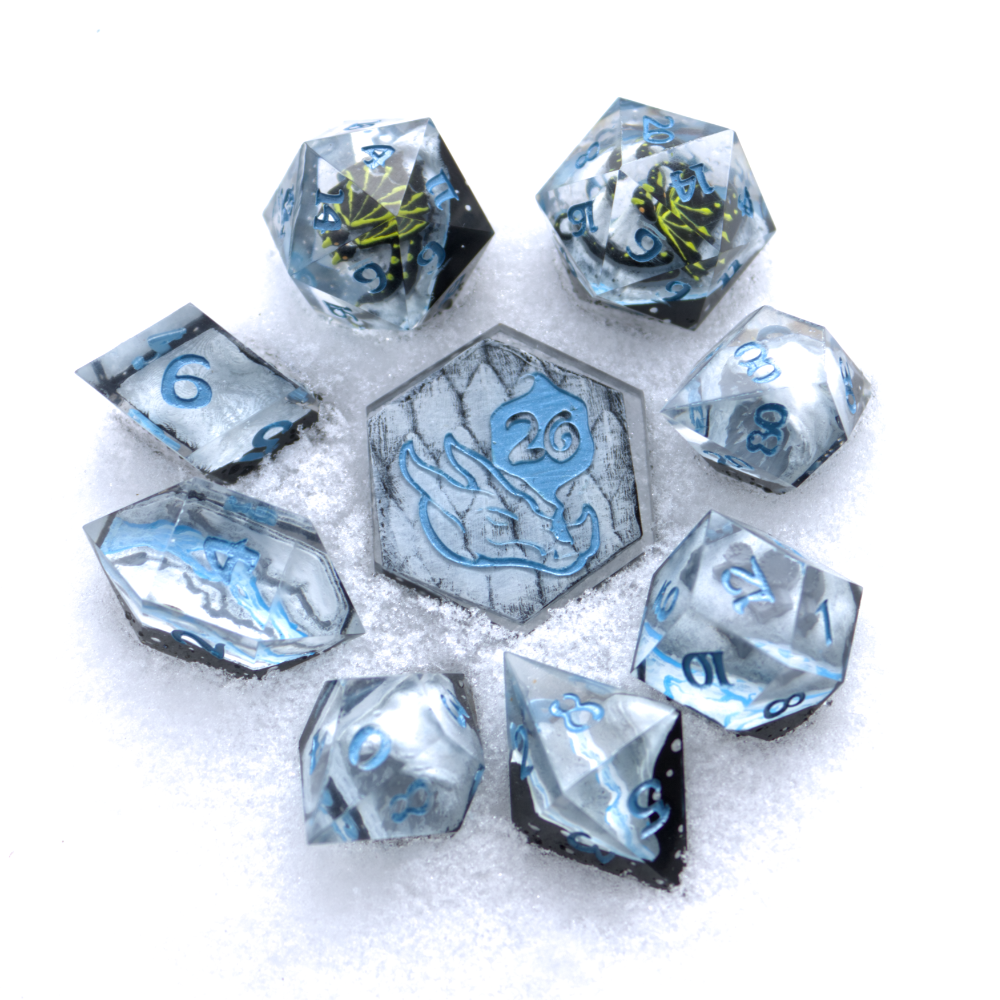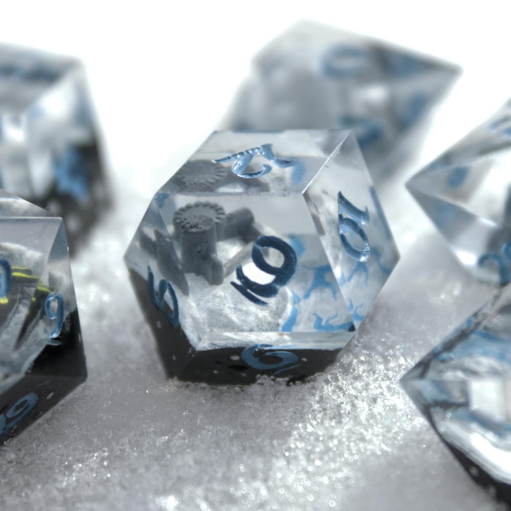 - Clear resin surrounding custom 3d modeled and handpainted Mythical Landscape Inclusions. D20's depict a Dragon curled across three mountain tops. D12 is a castle on the shore of a lake. D10 and D00 are creating cliffsides. D8 is a narrow valley. D6 is a gentle rolling plain. D4 is a snaking creek. Finally, the D2 coin is dragon scales.