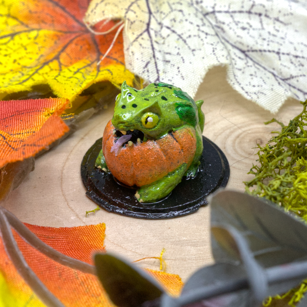 - 3D Printed Pumpkin Dragon Miniature. Handpainted with yellow/green eyes, Green leafy wings, and orange pumpkin belly. Small Sized Creature, 1" Diameter Base, 3/4" height