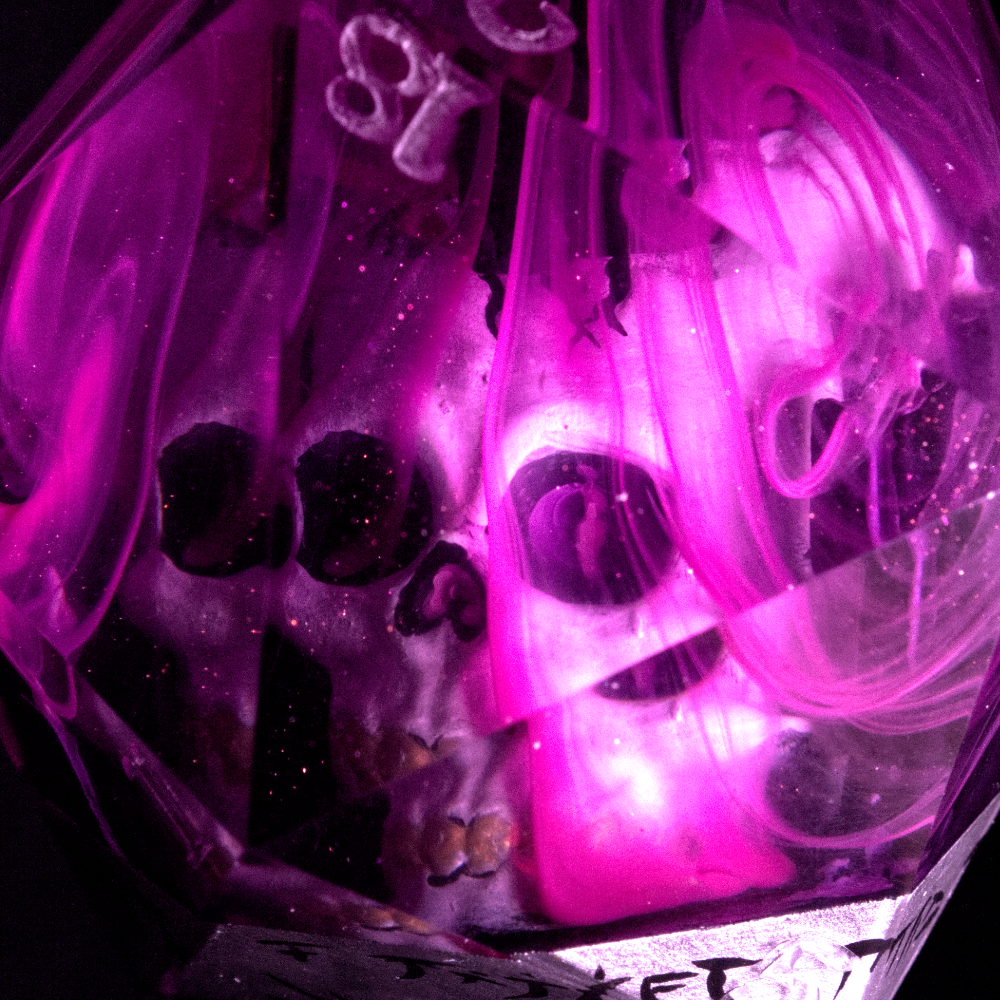 - A custom inclusion of a skull with dark purple candles at it's base and carved into the skulls center. Smokey pink wisps surrounding. Silver base with draconic script and arcane summoning symbols.