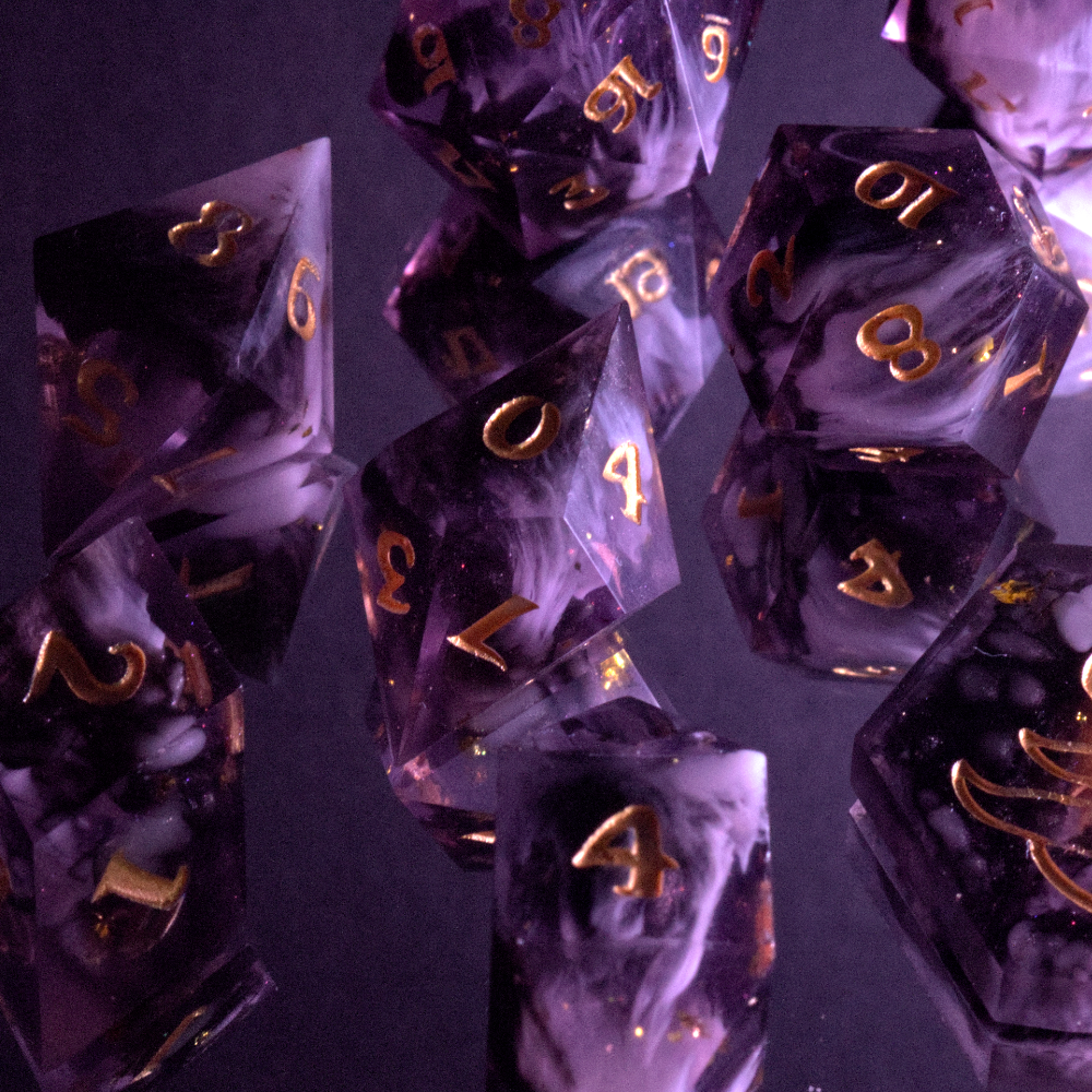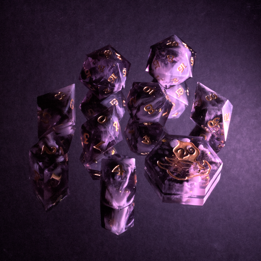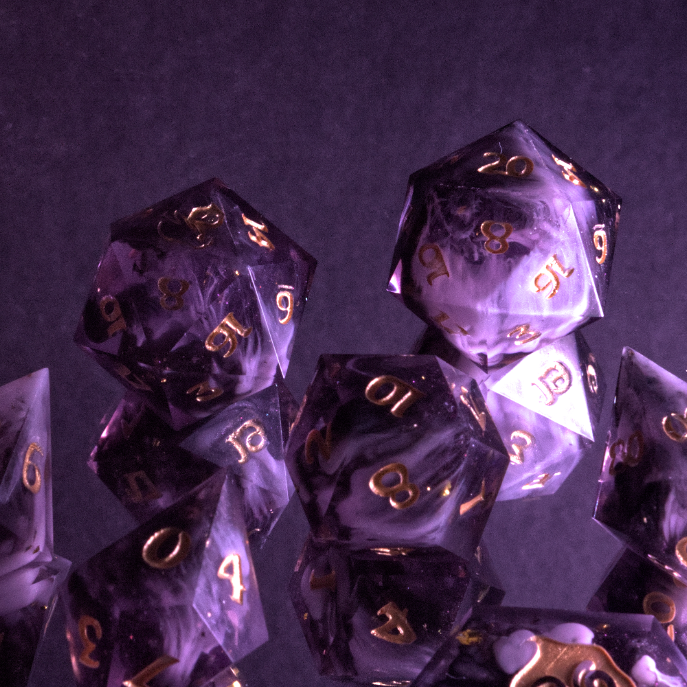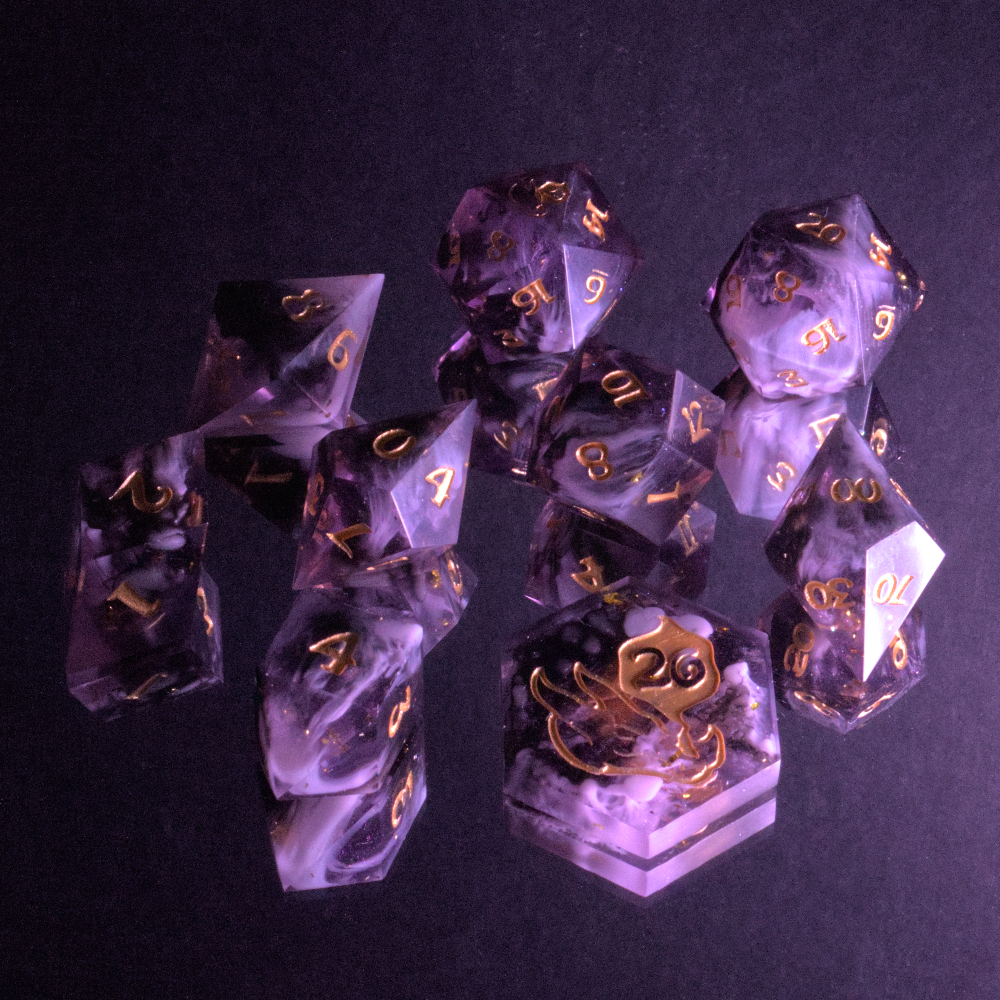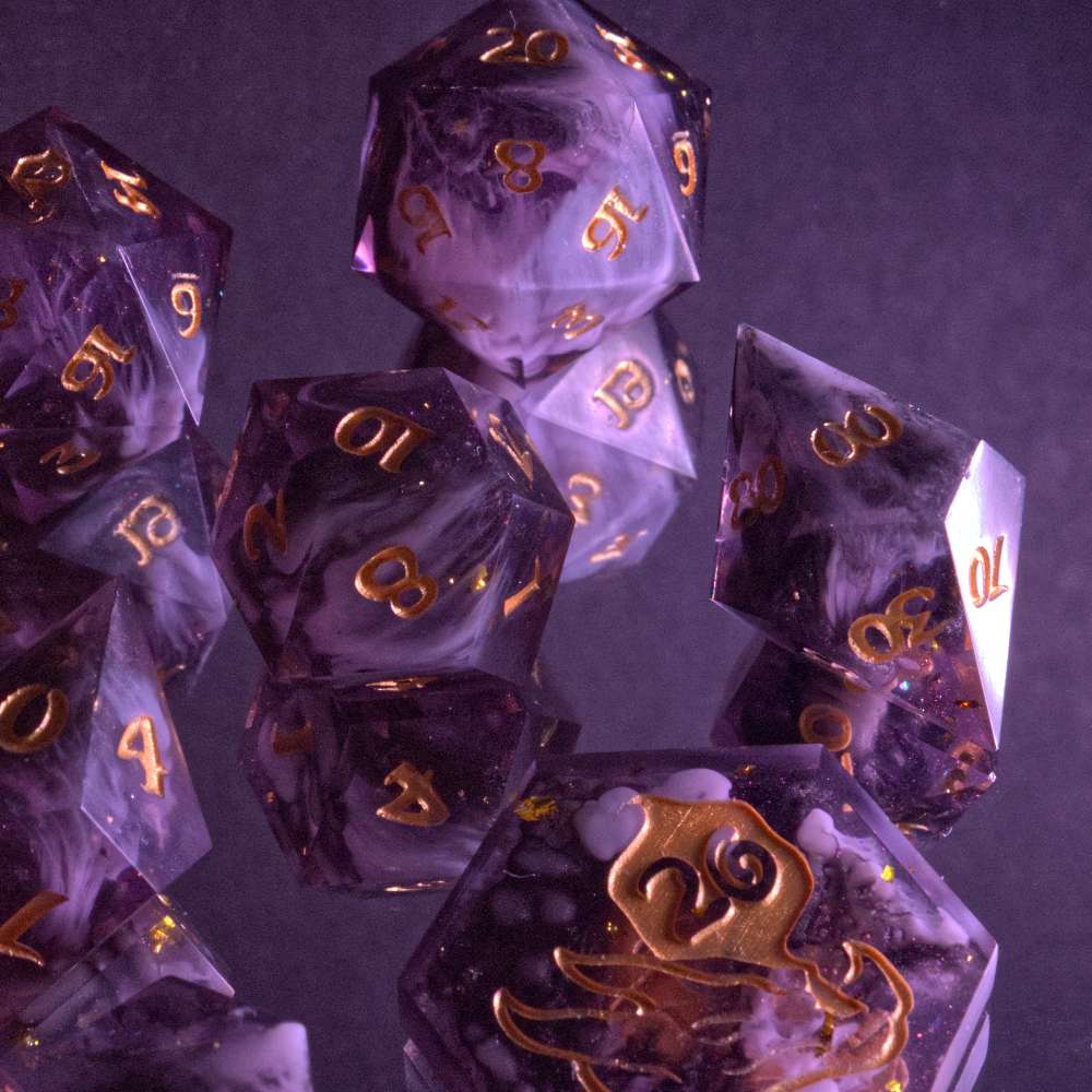 All my dice are custom designed and handcrafted, making them 100% unique. Each dice is individually molded and polished so that no two dice are ever the same. This also acknowledges that our dice have the occasional small imperfections such as scratches and bubbles, adding to their authenticity.