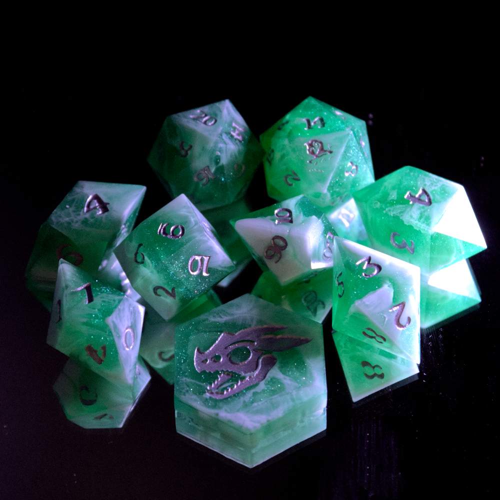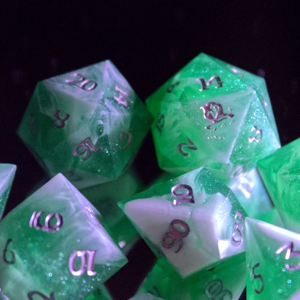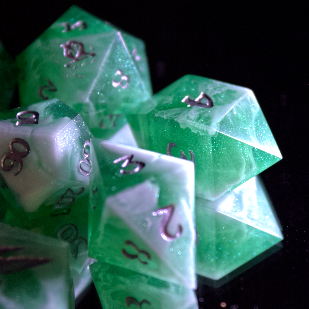 All my dice are custom designed and handcrafted, making them 100% unique. Each dice is individually molded and polished so that no two dice are ever the same. This also acknowledges that our dice have the occasional small imperfections such as scratches and bubbles, adding to their authenticity.